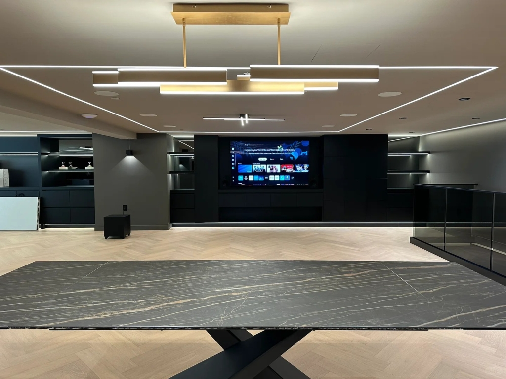 In this showroom, the lighting system is also integrated with the home theatre, motorized shades, distributed audio, security system, and garage door control. With one-touch scene activation, the entire space can transition into different intelligent modes. Remote access also allows lighting adjustments from anywhere, ensuring full control even while away.